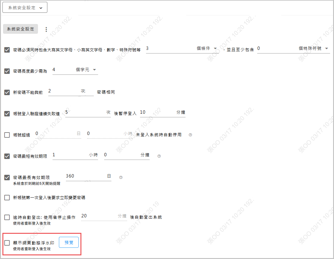 在系統中瀏覽表單、報表時,畫面即時顯示動態浮水印,內容包含登入者姓名等可識別的內容。