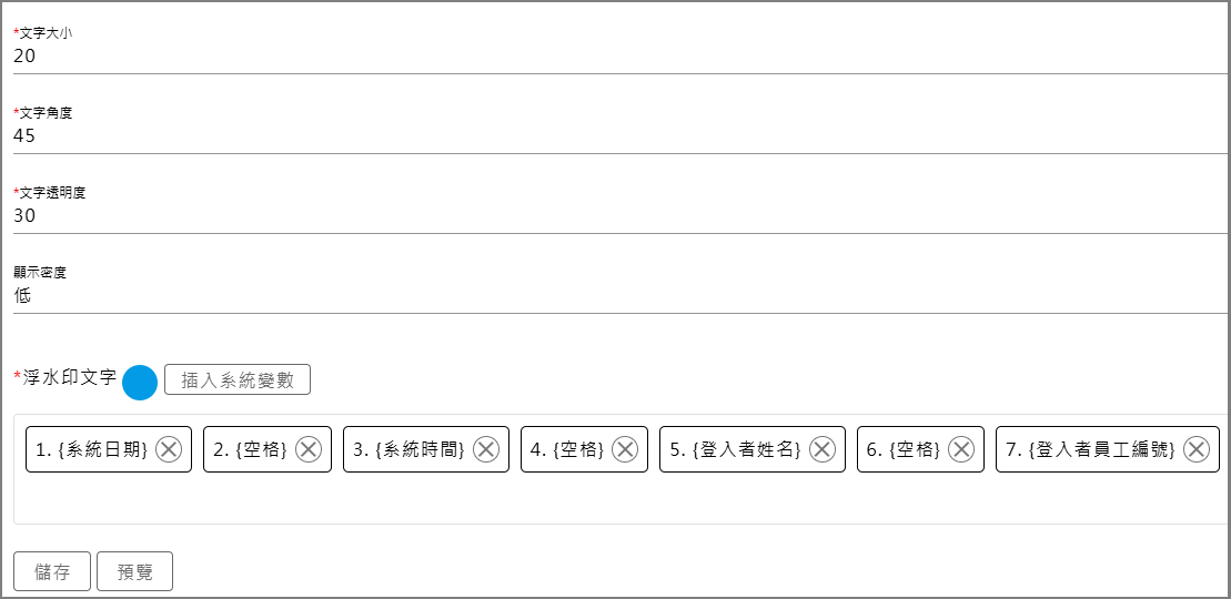 浮水印文字:可加入日期、時間、登入者姓名、IP等變數,建立可追溯的識別資訊