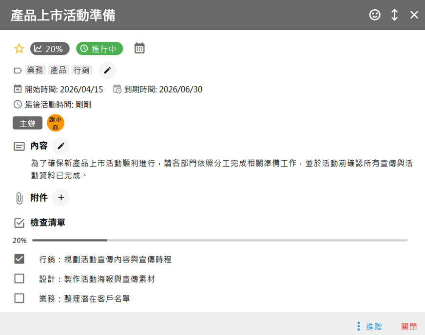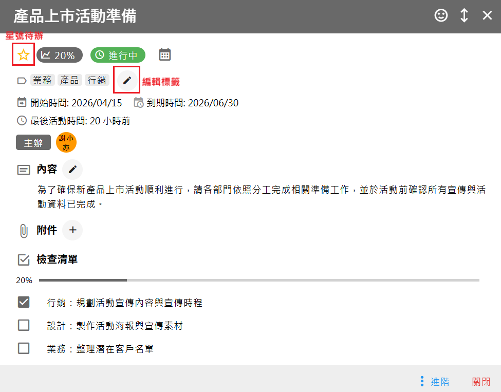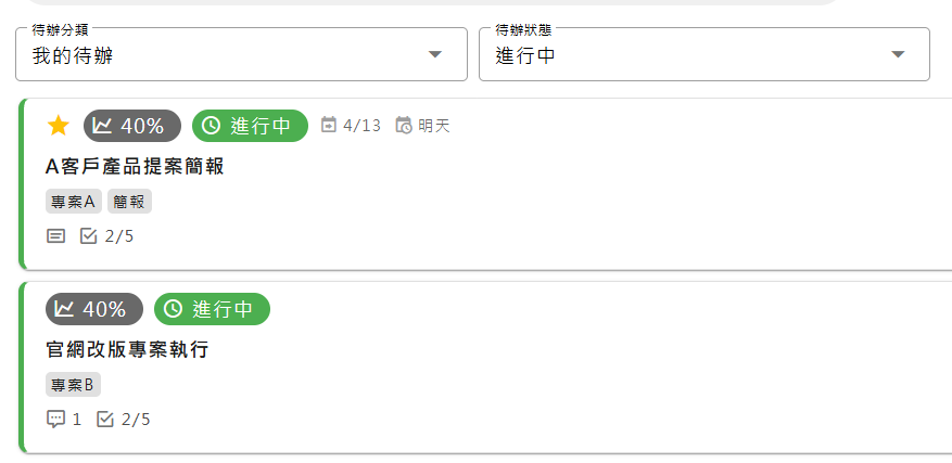待辦事項:狀態網際網路PowerEIP的模組名稱,可以記錄各項待辦事項,包含會議決議或各項日常工作任務,詳細功能請參閱本篇文章介紹。 延伸閱讀:EIP 系統是什麼?系統功能詳解:效率、協作一應俱全
